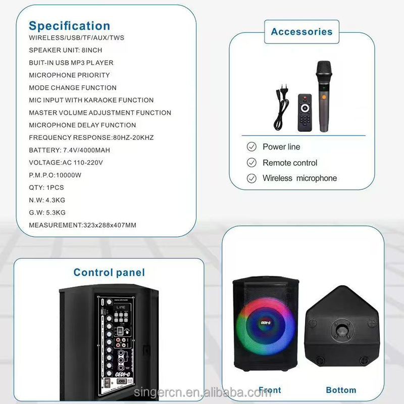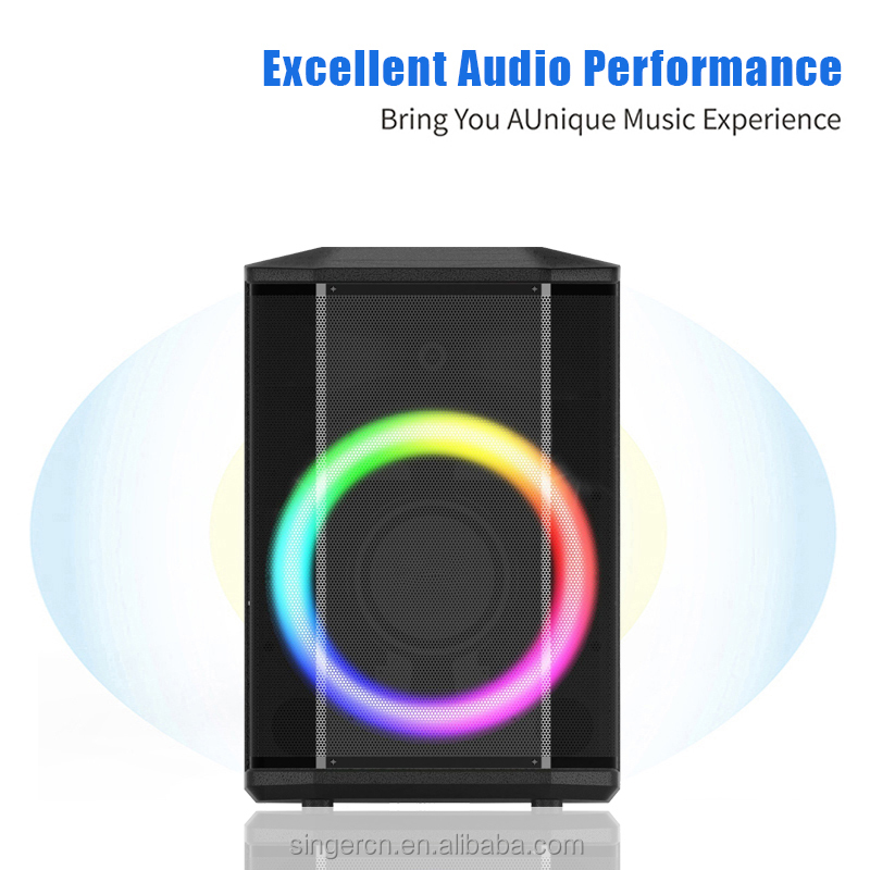Bluetooth, FM, USB, TF, AUX, MIC * 2, GT, ECHO, TREBLE, BASS, Rmote Control, беспроводной микрофон, RGB-подсветка