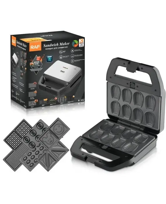 Название продукта7 в 1 сэндвич-мейкерФирменное наименованиеРАФНомер моделиR.552Напряжение (V)220-240 ВМощность (Вт)800 ВтИсточник питанияЭлектрическийРазмер коробки53,4*42*59,6 смФункция