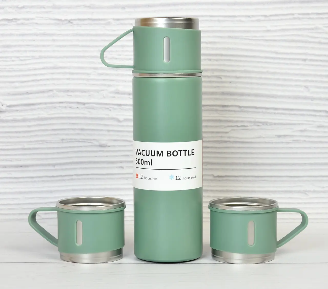 Термос с чашками вместимостью 500 мл и тремя чашками представляет собой компактное и удобное решение для транспортировки и подачи горячих или холодных напитков в любом месте. Вот некоторые характеристики и описание данного товара: