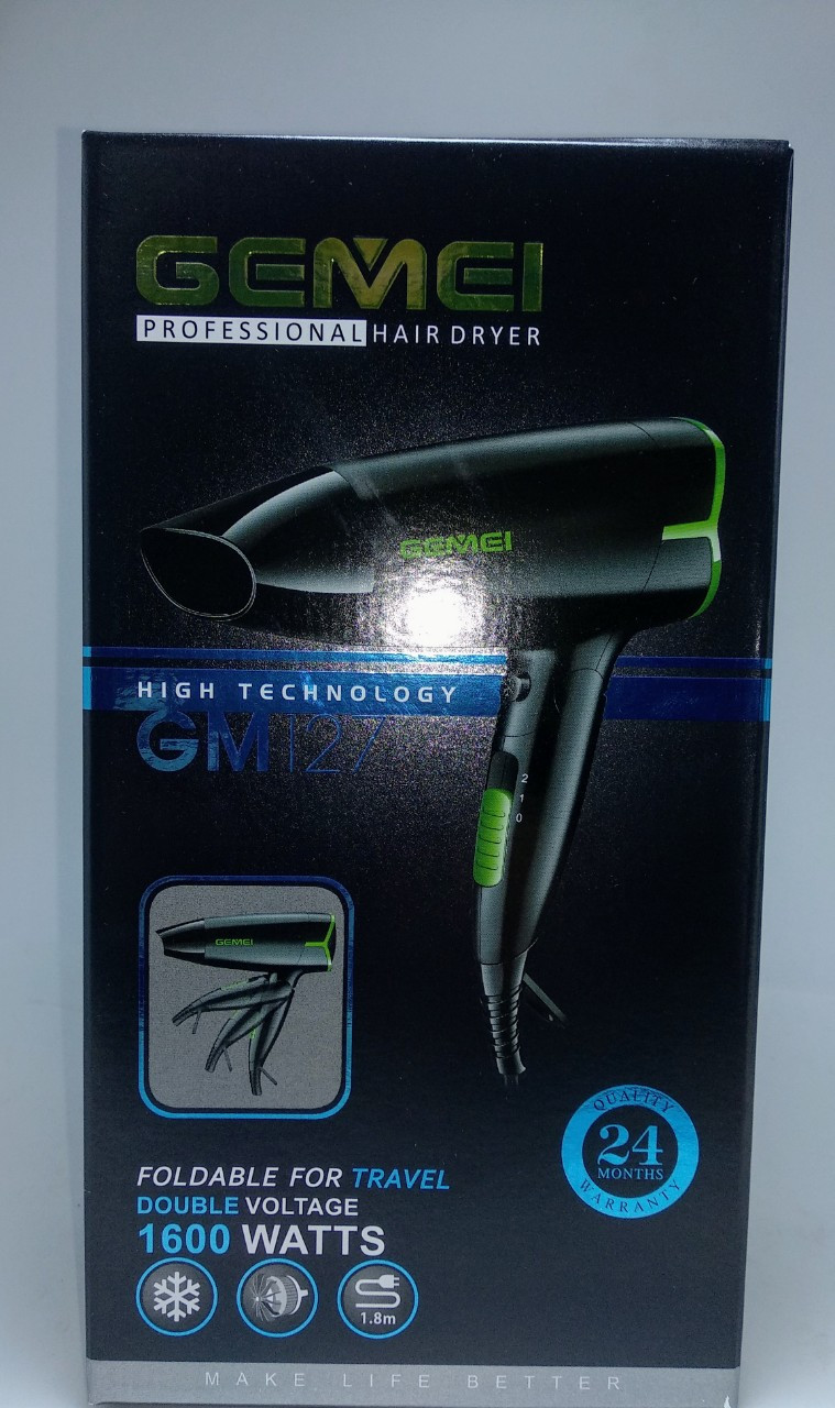 Эргономичный и функциональный дизайн фена Gemei GM127 привлекает своей стильностью и простотой. Фен имеет компактные габариты, имеет складную ручку,  поэтому такой фен будет очень удобен в поездках. Фен выполнен в приятном черном цвете. При этом Gemei GM127 имеет весьма внушительные возможности, мощность в 1600 Вт и две скорости нагрева и воздушного потока. Поэтому вам не составит труда быстро и легко высушить волосы, а чтобы сделать процесс сушки еще более легким, в комплекте прилагается насадка-концентратор. Шнур 1.5 метра. Для большего удобства фен оснащен крючком для подвешивания. Качественные технологии изготовления и наличие защиты от перегрева уберегут фен от преждевременного выхода из строя и обеспечат длительный срок качественной службы.