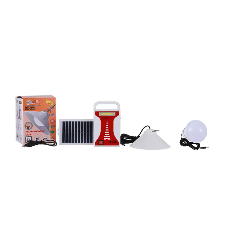 Название продукта: Домашняя солнечная система для домашнего освещения Пункт №: LL-5808 Материал: АБС Цвет: Синий/желтый/оранжевый/красный Батарея: 4500 мАч свинцово-кислотный Вес батареи: 450 г LED: Cob Размер продукта: 7*13*18 см Рабочее время: 3-4 часа для высокой яркости; 5-6 часов для ярче Время зарядки: 8-10 часов