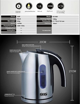 Электрический чайник DSP KK-1008 — это приятный дизайн, а также быстрая работа. Вместительность составляет — 1,2 литра.