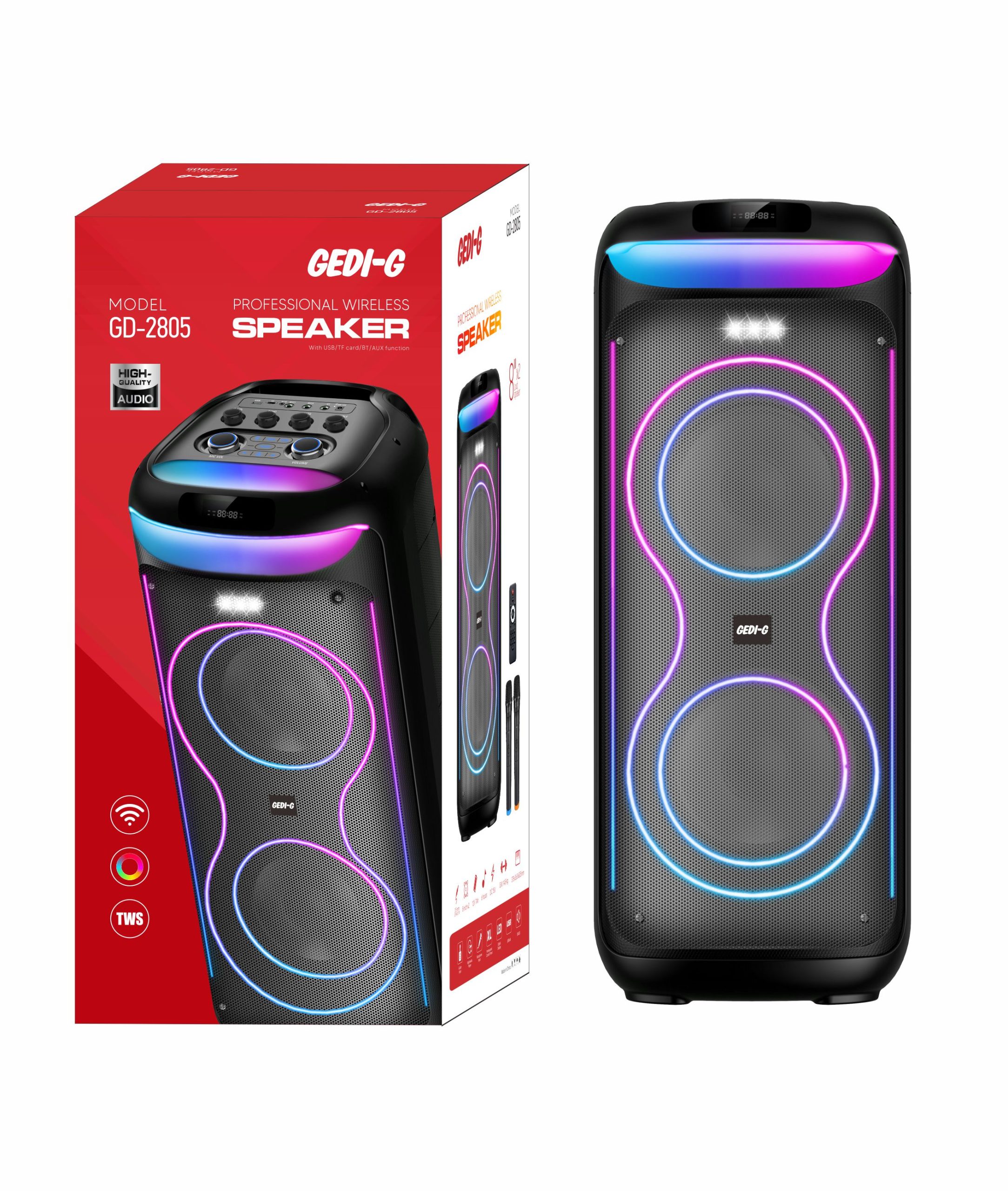 Портативная акустическая система GEDI GD-2805 — это мощная музыкальная колонка с яркой LED-подсветкой и поддержкой караоке, которая идеально подойдет для вечеринок, праздников, домашних мероприятий и отдыха на природе. Благодаря двум 8-дюймовым динамикам устройство обеспечивает глубокий бас, чистые средние частоты и насыщенное звучание, которое легко заполнит как комнату, так и открытую площадку.