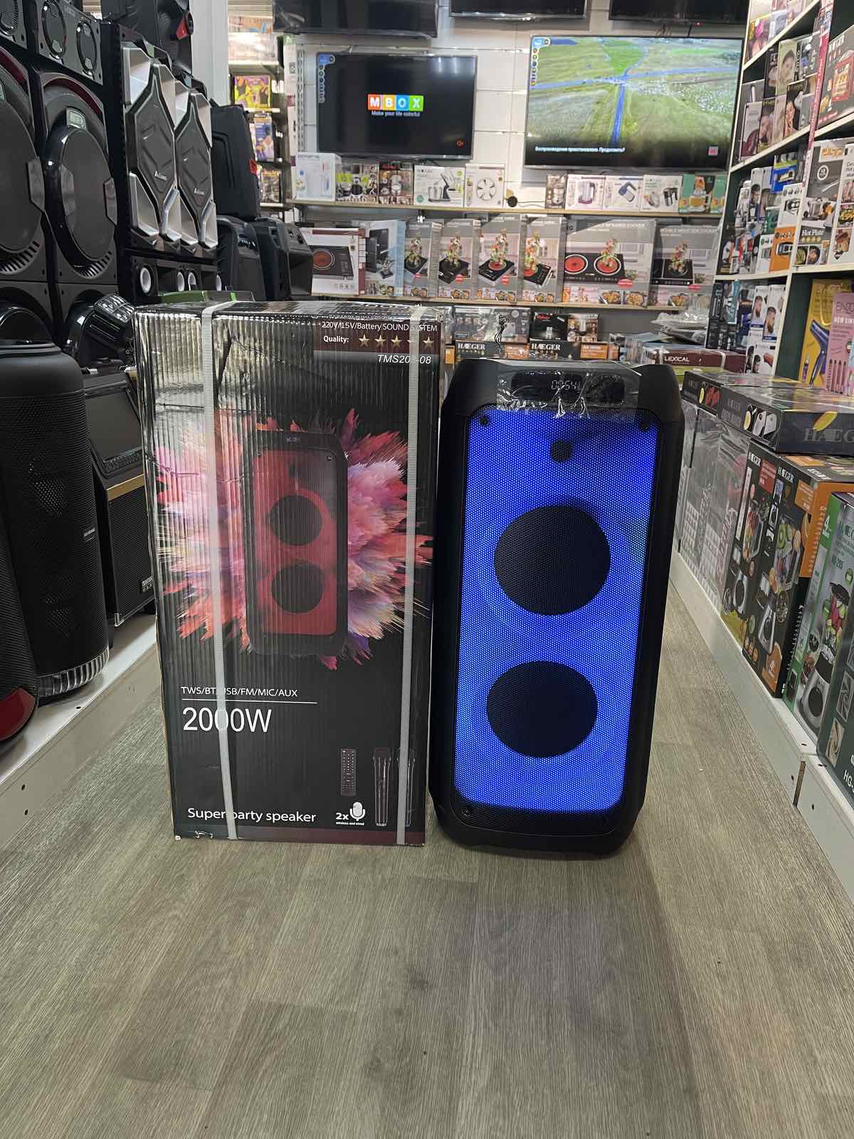 Bluetooth колонка два динамика 5″ bass speaker 2″ мощность 200Вт, два радио микрофона, LED дисплей, FM радио